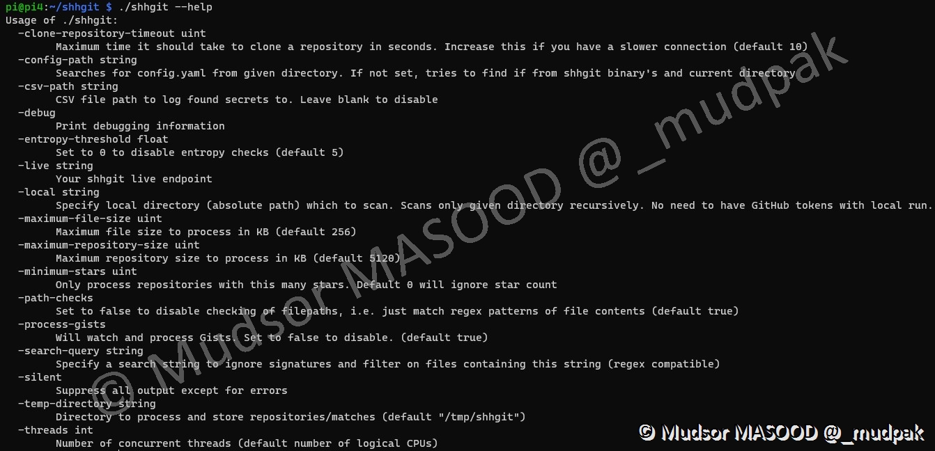 Pour afficher toutes les commandes de shhgit, exécuter la commande suivante :